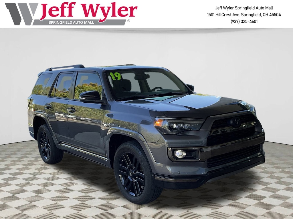 Jeff Wyler Springfield Auto Mall is excited to offer this outstanding-looking 2019 Toyota 4Runner in Magnetic Gray Metallic. Well equipped with: All-Weather Floor Liners/Cargo Tray Package, Nightshade Edition (Auto-Dimming Rear-View Mirror, Black Power Heated Mirrors, Black Roof Rails, Garage Door Opener, Moonroof w/Tilt Up & Slide, and Right & Left Individual Air Conditioner), Wilderness Package (DISC) (Roof Rack Cross Bars), Navigation System, 15 Speakers, 3.727 Axle Ratio, 4-Wheel Disc Brakes, ABS brakes, Air Conditioning, Alloy wheels, AM/FM radio: SiriusXM, Anti-whiplash front head restraints, Auto-dimming Rear-View mirror, Automatic temperature control, Brake assist, Bumpers: body-color, CD player, Compass, Delay-off headlights, Driver door bin, Driver vanity mirror, Dual front impact airbags, Dual front side impact airbags, Electronic Stability Control, Emergency communication system: Safety Connect, Exterior Parking Camera Rear, Front anti-roll bar, Front Bucket Seats, Front Center Armrest, Front dual zone A/C, Front fog lights, Front reading lights, Front wheel independent suspension, Fully automatic headlights, Garage door transmitter: HomeLink, Heated door mirrors, Heated front seats, Heated/Ventilated Front Bucket Seats, Illuminated entry, Knee airbag, Low tire pressure warning, Memory seat, Nightshade Leather Seat Trim, Occupant sensing airbag, Outside temperature display, Overhead airbag, Overhead console, Panic alarm, Passenger door bin, Passenger vanity mirror, Power door mirrors, Power driver seat, Power moonroof, Power passenger seat, Power steering, Power windows, Radio: Entune Premium JBL Audio w/Navigation, Rear anti-roll bar, Rear seat center armrest, Rear window defroster, Rear window wiper, Remote keyless entry, Roof rack: rails only, Security system, Speed control, Speed-sensing steering, Split folding rear seat, Spoiler, Steering wheel mounted audio controls, Tachometer, Telescoping steering wheel, Tilt steering wheel, Traction control, Trip computer, Turn signal indicator mirrors, Variably intermittent wipers, Ventilated front seats, and Wheels: 20" Black Alloy. Awards: * 2019 KBB.com Best Resale Value Awards * 2019 KBB.com Brand Image Awards Ask about available certifications. Used vehicles 10 years of age or newer with less than 100,000 miles are eligible for the Wyler Assurance Program, but eligible vehicles must pass our reconditioning process and multi-point inspection. Provided the vehicle passes inspection, vehicles will be eligible for the 6 month/6,000 mile limited warranty. The 6 month/6,000 mile limited warranty is NOT available on AS-IS vehicles, wholesale vehicles, lease buyback/pass-thru vehicles or un-inspected vehicles. Note that this program can also apply to vehicles where the remaining factory coverage is less than 6 months or 6,000 miles. Please check the Federal Trade Commission (FTC) Buyers guide on the vehicle for full details as to whether or not warranty coverage may apply. Contact Dealer for additional details. The Wyler Assurance 6 month/6,000 Mile limited warranty ends 6 months from the date of the Retail Purchase Agreement (BUYERS ORDER) or when the vehicle's odometer registers 6,000 additional miles to the mileage listed on the BUYERS ORDER, whichever comes first. Your Deductible - The warranty holder on your contract pays the first $100 of each covered repair.