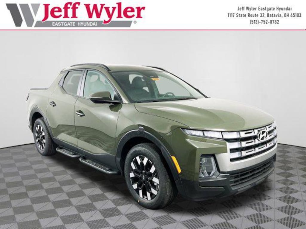 Priced below KBB Fair Purchase Price! Rockwood Green 2026 Hyundai Santa Cruz SEL 2.5L I4 AWD 8-Speed Automatic with SHIFTRONIC 21/29 City/Highway MPG Jeff Wyler Eastgate Auto Mall is delighted to offer this fantastic 2026 Hyundai Santa Cruz SEL in Rockwood Green. Well equipped with: Option Group 01, 18" x 7.5J Alloy Wheels, 4-Wheel Disc Brakes, 4.081 Axle Ratio, 6 Speakers, ABS brakes, Air Conditioning, Alloy wheels, AM/FM radio: SiriusXM, Apple CarPlay & Android Auto, Auto High-beam Headlights, Auto-leveling suspension, Automatic temperature control, Bed Cargo Net, Brake assist, Bumpers: body-color, Carpeted Floor Mats, Compass, Delay-off headlights, Driver door bin, Driver vanity mirror, Dual front impact airbags, Dual front side impact airbags, Electronic Stability Control, Emergency communication system: None, Exterior Parking Camera Rear, First Aid Kit, Four wheel independent suspension, Front anti-roll bar, Front Bucket Seats, Front Center Armrest, Front dual zone A/C, Front reading lights, Fully automatic headlights, H-Tex Leatherette Seat Trim, Heated door mirrors, Heated Front Bucket Seats, Heated front seats, Hood Applique, Illuminated entry, Low tire pressure warning, Occupant sensing airbag, Outside temperature display, Overhead airbag, Overhead console, Panic alarm, Passenger door bin, Passenger vanity mirror, Power door mirrors, Power driver seat, Power moonroof, Power steering, Power windows, Radio data system, Radio: AM/FM/HD Audio System, Rear anti-roll bar, Rear reading lights, Rear side impact airbag, Rear step bumper, Rear window defroster, Remote keyless entry, Security system, Side Steps, Speed control, Speed-sensing steering, Split folding rear seat, Spoiler, Steering wheel mounted audio controls, Tachometer, Telescoping steering wheel, Tilt steering wheel, Traction control, Trip computer, Turn signal indicator mirrors, and Variably intermittent wipers. 21/29 City/Highway MPG Price includes: $1750 - Retail Bonus Cash. Exp. 04/30/2026