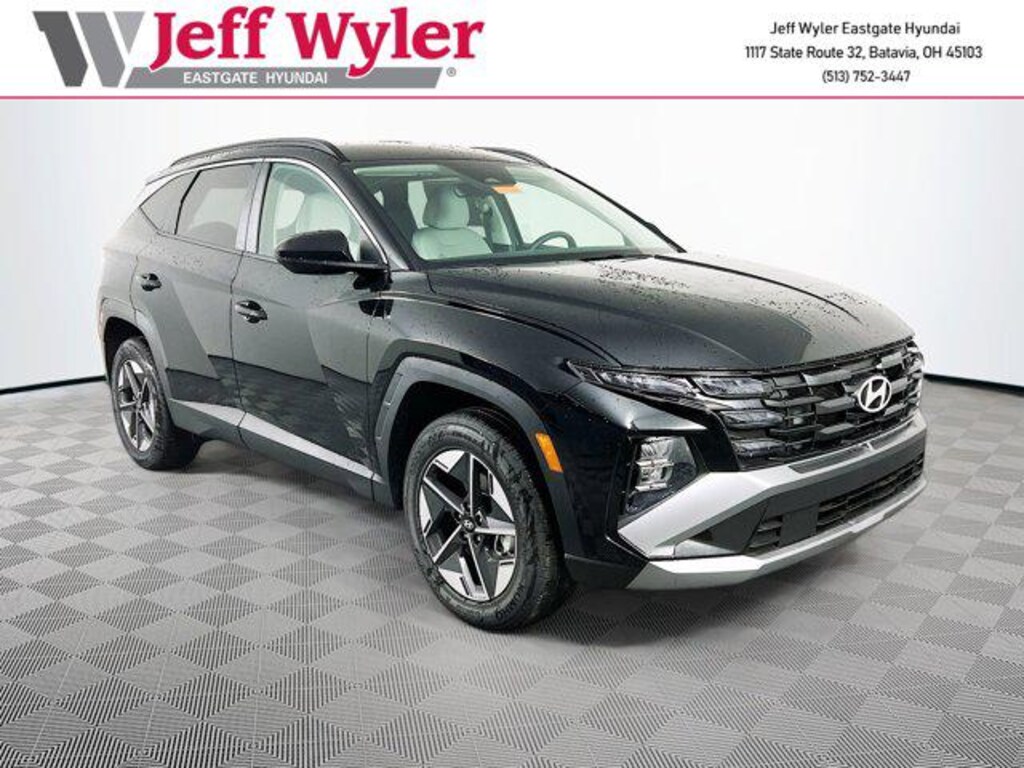Phantom Black 2026 Hyundai Tucson SEL 2.5L I4 DGI DOHC 16V LEV3-SULEV30 187hp AWD 8-Speed Automatic with SHIFTRONIC 24/30 City/Highway MPG Jeff Wyler Eastgate Auto Mall is honored to offer this fantastic 2026 Hyundai Tucson SEL in Phantom Black. Well equipped with: Option Group 01, 18" x 7.5J Alloy Wheels, 4-Wheel Disc Brakes, 6 Speakers, ABS brakes, Air Conditioning, Alloy wheels, AM/FM radio: SiriusXM, Apple CarPlay & Android Auto, Auto High-beam Headlights, Automatic temperature control, Brake assist, Bumpers: body-color, Cargo Cover, Cargo Net, Cargo Organizer, Cargo Tray, Carpeted Floor Mats, Delay-off headlights, Driver door bin, Driver vanity mirror, Dual front impact airbags, Dual front side impact airbags, Electronic Stability Control, Emergency communication system: Bluelink+, First Aid Kit, Four wheel independent suspension, Front anti-roll bar, Front Bucket Seats, Front Center Armrest, Front dual zone A/C, Front reading lights, Fully automatic headlights, H-Tex Leatherette Seat Trim, Heated door mirrors, Heated Front Bucket Seats, Heated front seats, Illuminated Door Sills, Illuminated entry, Low tire pressure warning, Occupant sensing airbag, Outside temperature display, Overhead airbag, Overhead console, Panic alarm, Passenger door bin, Passenger vanity mirror, Power door mirrors, Power driver seat, Power Liftgate, Power steering, Power windows, Radio data system, Radio: AM/FM/HD Audio System, Rear anti-roll bar, Rear reading lights, Rear seat center armrest, Rear side impact airbag, Rear window defroster, Rear window wiper, Remote keyless entry, Security system, Severe Weather Kit, Speed control, Split folding rear seat, Spoiler, Steering wheel mounted audio controls, Tachometer, Telescoping steering wheel, Tilt steering wheel, Traction control, Trip computer, and Variably intermittent wipers. 24/30 City/Highway MPG