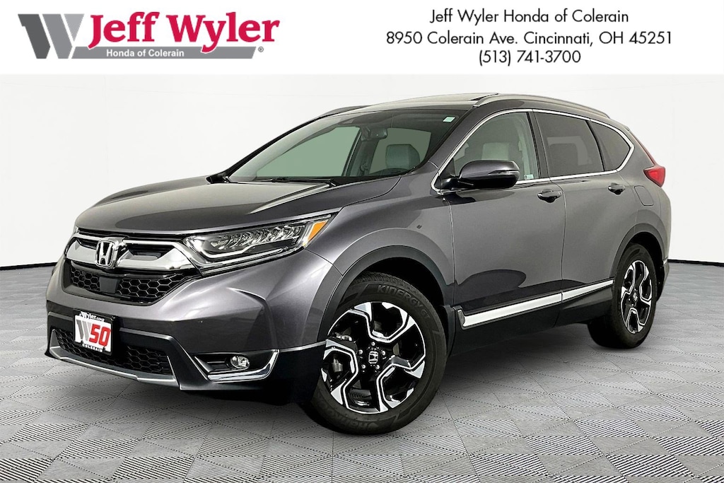 Jeff Wyler Honda of Colerain is excited to offer this good-looking 2019 Honda CR-V Touring in Modern Steel Metallic. Well equipped with: 18" Alloy Wheels, 4-Wheel Disc Brakes, 5.64 Axle Ratio, 9 Speakers, ABS brakes, Air Conditioning, Alloy wheels, AM/FM radio: SiriusXM, Apple CarPlay/Android Auto, Auto High-beam Headlights, Auto-dimming Rear-View mirror, Automatic temperature control, Blind Spot Information (BSI) System warning, Brake assist, Bumpers: body-color, Compass, Delay-off headlights, Driver door bin, Driver vanity mirror, Dual front impact airbags, Dual front side impact airbags, Electronic Stability Control, Exterior Parking Camera Rear, Forward collision: Collision Mitigation Braking System (CMBS) + FCW mitigation, Four wheel independent suspension, Front anti-roll bar, Front Bucket Seats, Front Center Armrest, Front dual zone A/C, Front fog lights, Front reading lights, Fully automatic headlights, Garage door transmitter: HomeLink, Heated door mirrors, Heated Front Bucket Seats, Heated front seats, Illuminated entry, Lane departure: Lane Keeping Assist System (LKAS) active, Leather Seat Trim, Leather Shift Knob, Low tire pressure warning, Memory seat, Navigation system: Honda Satellite-Linked Navigation System, Occupant sensing airbag, Outside temperature display, Overhead airbag, Overhead console, Panic alarm, Passenger door bin, Passenger vanity mirror, Power door mirrors, Power driver seat, Power Liftgate, Power moonroof, Power passenger seat, Power steering, Power windows, Radio data system, Radio: AM/FM/HD/SiriusXM Audio System, Rain sensing wipers, Rear anti-roll bar, Rear seat center armrest, Rear window defroster, Rear window wiper, Remote keyless entry, Roof rack: rails only, Security system, Speed control, Speed-sensing steering, Speed-Sensitive Wipers, Split folding rear seat, Spoiler, Steering wheel mounted audio controls, Tachometer, Telescoping steering wheel, Tilt steering wheel, Traction control, Trip computer, Turn signal indicator mirrors, and Variably intermittent wipers.