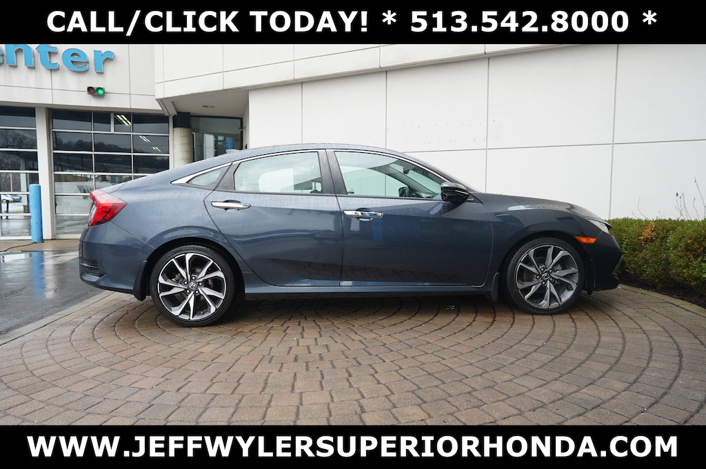Jeff Wyler Superior Honda is delighted to offer this beautiful 2021 Honda Civic Touring in Cosmic Blue Metallic. BLUETOOTH, LEATHER, MOONROOF SUNROOF, REMAINDER OF FACTORY WARRANTY, and RECENT SUPERIOR TRADE Civic Touring, 4D Sedan, 1.5L I-4 DI DOHC Turbocharged, CVT, FWD, Cosmic Blue Metallic, Gray Cloth, 10 Speakers, 4-Wheel Disc Brakes, ABS brakes, Adaptive Cruise Control: Adaptive Cruise Control (ACC) with Low-Speed Follow, Air Conditioning, Alloy wheels, AM/FM radio: SiriusXM, Apple CarPlay/Android Auto, Auto High-beam Headlights, Auto-dimming Rear-View mirror, Automatic temperature control, Brake assist, Bumpers: body-color, Compass, Delay-off headlights, Driver door bin, Driver vanity mirror, Dual front impact airbags, Dual front side impact airbags, Electronic Stability Control, Emergency communication system: HondaLink, Exterior Parking Cameras, Forward collision: Collision Mitigation Braking System (CMBS) + FCW mitigation, Four wheel independent suspension, Front anti-roll bar, Front Bucket Seats, Front Center Armrest, Front dual zone A/C, Front fog lights, Front reading lights, Fully automatic headlights, Garage door transmitter: HomeLink, Heated door mirrors, Heated Front Bucket Seats, Heated front seats, Heated rear seats, Illuminated entry, Lane departure: Lane Keeping Assist System (LKAS) active, Leather Seat Trim, Leather Shift Knob, Low tire pressure warning, Navigation system: Honda Satellite-Linked Navigation System, Occupant sensing airbag, Outside temperature display, Overhead airbag, Overhead console, Panic alarm, Passenger door bin, Passenger vanity mirror, Power door mirrors, Power driver seat, Power moonroof, Power passenger seat, Power steering, Power windows, Radio data system, Radio: 450-Watt AM/FM/HD/SiriusXM Audio System, Rain sensing wipers, Rear anti-roll bar, Rear seat center armrest, Rear window defroster, Remote keyless entry, Security system, Speed control, Speed-sensing steering, Speed-Sensitive Wipers, Split folding rear seat, Spoiler, Steering wheel mounted audio controls, Tachometer, Telescoping steering wheel, Tilt steering wheel, Traction control, Trip computer, Turn signal indicator mirrors, Variably intermittent wipers, and Wheels: 18" Alloy w/Gloss Shark Gray Inserts Our PRE-OWNED vehicles are put through a rigorous 167- POINT QUALITY ASSURANCE INSPECTION along with an average amount of over $1,400.00 SPENT to recondition each vehicle so we can be sure to deliver you the highest quality vehicle like you deserve! ***ONLINE PRICE DOES NOT INCLUDE WYLER FAMILY FIRST PACKAGE*** Stop by 4777 Spring Grove Ave. Road to see for yourself, or give us a call @ 283-209-1858 to schedule your test drive!Vehicle pricing includes all offers and incentives. Due to limited inventory, offers and pricing are all subject to change. Tax, Title, Tags and $387 doc fees are not included in vehicle price shown and must be paid by the purchaser. Doc fees vary by location. Financing w/approved credit. Mileage est. Based on current EPA estimates reflecting new EPA methods beginning w/ 2008 models. For comparison only. Do not compare to pre 2008 models. Actual mileage may vary based on how you drive and maintain your vehicle. Information on this site includes 3rd party data believed to be reliable, subject to change without notice. Jeff Wyler reserves the right to correct any errors and/or omissions in the compilation or presentation of this data and makes no representations express or implied to any prospective purchaser as to the vehicle's condition, specifications, history, equipment or equipment function, price or warranties. This vehicle may be subject to an open recall that has not been repaired. Please consult safercar.gov for more information on the current status. It is the responsibility of purchaser to confirm any data prior to purchase. Other than MSRP, all offers only apply to this vehicle and are subject to change. Vehicle prices are subject to change and all vehicles are subject to prior sale an