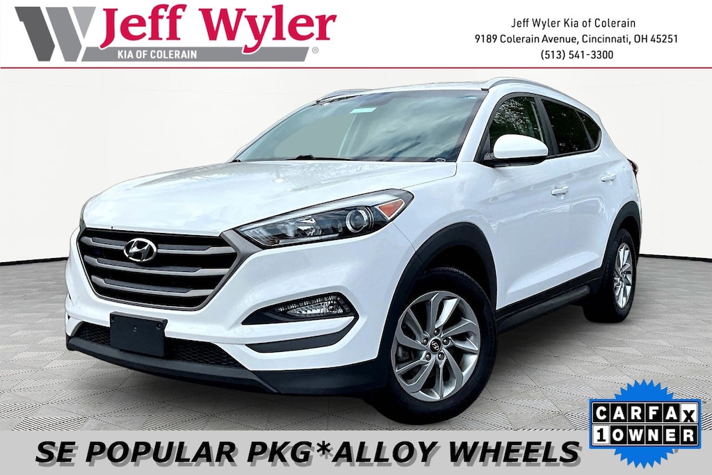 Jeff Wyler Kia of Colerain is proud to offer this beautiful 2016 Hyundai Tucson SE in White. SE Popular Package 02 (8-Way Power Driver Seat Adjuster, Driver Power Window w/Auto Up/Down, Dual Illuminated Vanity Mirrors, Fog Lamps, Illuminated Glove Box, LED Daytime Running Lights, Premium Side Sills, and Roof Rack Side Rails), 3.510 Axle Ratio, 4-Wheel Disc Brakes, 6 Speakers, ABS brakes, Air Conditioning, Alloy wheels, AM/FM radio: SiriusXM, Anti-whiplash front head restraints, Brake assist, Bumpers: body-color, Cargo Net, Carpeted Floor Mats, CD player, Delay-off headlights, Driver door bin, Driver vanity mirror, Dual front impact airbags, Dual front side impact airbags, Electronic Stability Control, Exterior Parking Camera Rear, Four wheel independent suspension, Front anti-roll bar, Front Bucket Seats, Front Bucket Seats w/Power Driver's Seat, Front Center Armrest, Front reading lights, Fully automatic headlights, Heated door mirrors, Illuminated entry, Low tire pressure warning, Occupant sensing airbag, Option Group 02, Overhead airbag, Overhead console, Panic alarm, Passenger door bin, Passenger vanity mirror, Power door mirrors, Power steering, Power windows, Radio: Autonet AM/FM/SiriusXM/CD/MP3 Audio System, Rear anti-roll bar, Rear seat center armrest, Rear window defroster, Rear window wiper, Remote keyless entry, Security system, Speed control, Speed-sensing steering, Split folding rear seat, Spoiler, Steering wheel mounted audio controls, Tachometer, Telescoping steering wheel, Tilt steering wheel, Traction control, Trip computer, Variably intermittent wipers, and Wheels: 17 X 7.0JJ Alloys Our PRE-OWNED vehicles are put through a rigorous 167- POINT QUALITY ASSURANCE INSPECTION along with an average amount of over $1,400.00 SPENT to recondition each vehicle so we can be sure to deliver you the highest quality vehicle like you deserve! ***ONLINE PRICE DOES NOT INCLUDE WYLER FAMILY FIRST PACKAGE***