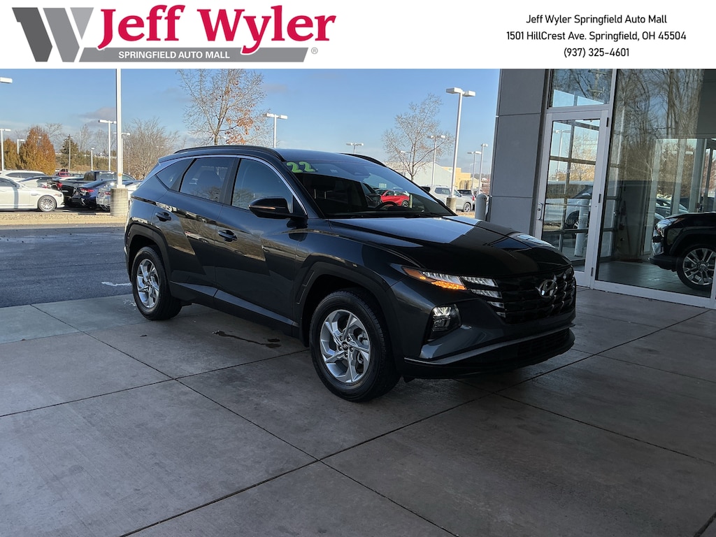 Jeff Wyler Springfield Auto Mall is honored to offer this terrific 2022 Hyundai Tucson SEL in Portofino Gray. Well equipped with: Option Group 01, 3.648 Axle Ratio, 4-Wheel Disc Brakes, 6 Speakers, ABS brakes, Air Conditioning, Alloy wheels, AM/FM radio: SiriusXM, Apple CarPlay & Android Auto, Auto High-beam Headlights, Brake assist, Bumpers: body-color, Cargo Net, Cargo Tray, Carpeted Floor Mats, Delay-off headlights, Driver door bin, Driver vanity mirror, Dual front impact airbags, Dual front side impact airbags, Electronic Stability Control, Emergency communication system: Blue Link Connected Car Service (3-year complimentary subscription), First Aid Kit, Four wheel independent suspension, Front and Rear Mudguards, Front anti-roll bar, Front Bucket Seats, Front Center Armrest, Front reading lights, Fully automatic headlights, Heated door mirrors, Heated Front Bucket Seats, Heated front seats, Illuminated entry, Low tire pressure warning, Occupant sensing airbag, Outside temperature display, Overhead airbag, Overhead console, Panic alarm, Passenger door bin, Passenger vanity mirror, Power door mirrors, Power driver seat, Power steering, Power windows, Radio data system, Radio: AM/FM/HD/SiriusXM Audio System, Rear anti-roll bar, Rear Bumper Applique, Rear seat center armrest, Rear window defroster, Rear window wiper, Remote keyless entry, Roof rack: rails only, Security system, Speed control, Split folding rear seat, Spoiler, Stain & Odor Resistant Cloth Seat Trim, Steering wheel mounted audio controls, Tachometer, Telescoping steering wheel, Tilt steering wheel, Tow Hitch, Traction control, Trip computer, Turn signal indicator mirrors, Variably intermittent wipers, Wheel Locks, and Wheels: 17" x 7.0J" Alloy. Ask about available certifications. Used vehicles 10 years of age or newer with less than 100,000 miles are eligible for the Wyler Assurance Program, but eligible vehicles must pass our reconditioning process and multi-point inspection. Provided the vehicle passes inspection, vehicles will be eligible for the 6 month/6,000 mile limited warranty. The 6 month/6,000 mile limited warranty is NOT available on AS-IS vehicles, wholesale vehicles, lease buyback/pass-thru vehicles or un-inspected vehicles. Note that this program can also apply to vehicles where the remaining factory coverage is less than 6 months or 6,000 miles. Please check the Federal Trade Commission (FTC) Buyers guide on the vehicle for full details as to whether or not warranty coverage may apply. Contact Dealer for additional details. The Wyler Assurance 6 month/6,000 Mile limited warranty ends 6 months from the date of the Retail Purchase Agreement (BUYERS ORDER) or when the vehicle's odometer registers 6,000 additional miles to the mileage listed on the BUYERS ORDER, whichever comes first. Your Deductible - The warranty holder on your contract pays the first $100 of each covered repair.