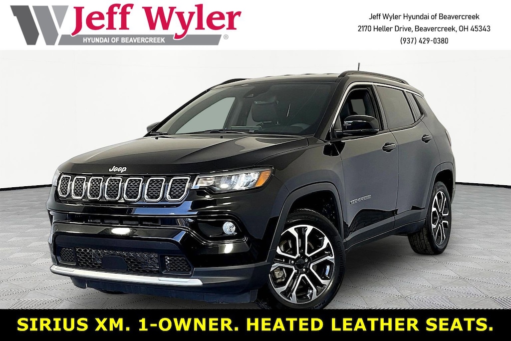 CARFAX One-Owner. Clean CARFAX. Jeff Wyler Hyundai of Beavercreek is proud to offer this stunning-looking 2023 Jeep Compass Limited in Diamond Black Crystal Pearlcoat. Well equipped with: Quick Order Package 29G, 10.1" Touchscreen Display, 3.73 Final Drive Ratio, 4-Wheel Disc Brakes, 6 Speakers, ABS brakes, Air Conditioning, Alloy wheels, AM/FM radio: SiriusXM, Auto High-beam Headlights, Auto-dimming Rear-View mirror, Automatic temperature control, Body Color Roof, Brake assist, Bumpers: body-color, Compass, Delay-off headlights, Disassociated Touchscreen Display, Driver door bin, Driver vanity mirror, Dual front impact airbags, Dual front side impact airbags, Electronic Stability Control, Four wheel independent suspension, Front anti-roll bar, Front Bucket Seats, Front Center Armrest w/Storage, Front dual zone A/C, Front fog lights, Front reading lights, Fully automatic headlights, Heated door mirrors, Heated front seats, Heated steering wheel, Hidden Exhaust Tips-Dual, Illuminated entry, Knee airbag, Leather Shift Knob, Leatherette Seats, Low tire pressure warning, Occupant sensing airbag, Outside temperature display, Overhead airbag, Overhead console, Panic alarm, ParkView Rear Back-Up Camera, Passenger door bin, Passenger vanity mirror, Power door mirrors, Power driver seat, Power steering, Power windows, Radio: Uconnect 5 w/10.1" Display, Rain sensing wipers, Rear anti-roll bar, Rear seat center armrest, Rear window defroster, Rear window wiper, Remote keyless entry, Security system, SiriusXM Radio Service, Speed control, Split folding rear seat, Spoiler, Steering wheel mounted audio controls, Tachometer, Telescoping steering wheel, Tilt steering wheel, Traction control, Trip computer, Turn signal indicator mirrors, Variably intermittent wipers, and Wheels: 18" x 7" Painted Diamond Cut Aluminum.Come see the excitement at Jeff Wyler Hyundai of Beavercreek! Visit us online at www.jeffwylerhyundaiofbeavercreek.com Proudly Serving: Cincinnati, Dayton, Centeville, Ketttering, Moraine,Beavercreek, Xenia,Oakwood, Trotwood, Vandalia, Kettering, Wright Patterson, Riverside, Engelwood, Miamisburg, Huber Heights, Springboro, Brookville, Fairborn, West Carrollton, Yellow Springs, Bellbrook, Springfield Columbus, Hamilton, West Chester, Monroe, Fairfield. PROUDLY SERVING: CINCINNATI, DAYTON,COLUMBUS, LOUISVILLE, LEXINGTON, INDIANAPOLIS,HAMILTON, FLORENCE, ALEXANDRIA, BEAVERCREEK, SPRINGDALE, WEST CHESTER, MONROE, FAIRFIELD, KENWOOD, NEWPORT AND ALL OF GREATER CINCINNATI OHIO, INDIANA, AND NORTHERN KENTUCKY.