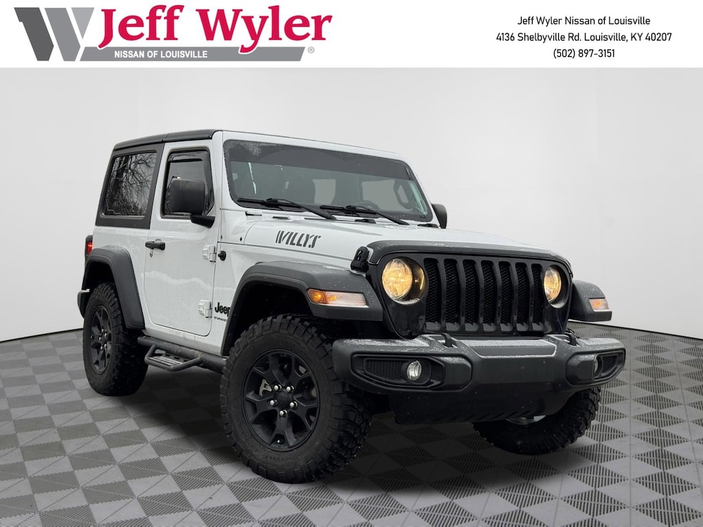 Jeff Wyler Nissan of Louisville is pumped up to offer this terrific-looking and fun 2023 Jeep Wrangler Willys in Bright White Clearcoat. ** ALL WHEEL DRIVE/AWD **, ** BALANCE OF FACTORY WARRANTY **, ** CLEAN CARFAX REPORT **, ** BLUETOOTH **, ** BACKUP CAMERA **, ** EXCELLENT SERVICE HISTORY **, and ** LOCALLY OWNED ** Quick Order Package 25K Willys Sport (4-Wheel Drive Swing Gate Decal, Anti-Spin Differential Rear Axle, Black Grille, Deep Tint Sunscreen Windows, Mold In Color Bumper w/Gloss Black, MOPAR All-Weather Floor Mats, Wheels: 17" x 7.5" Black Aluminum, Willys, and Willys Hood Decal), ABS brakes, Black 3-Piece Hard Top, Compass, Electronic Stability Control, Freedom Panel Storage Bag, Low tire pressure warning, No Soft Top, ParkView Rear Back-Up Camera, Rear Window Defroster, Rear Window Wiper/Washer, Traction control, 3.45 Overall Top Gear Ratio, 4-Wheel Disc Brakes, 8 Speakers, AM/FM radio, Apple CarPlay, Apple CarPlay/Android Auto, Auxiliary Battery, Brake assist, Cloth Low-Back Bucket Seats, Delay-off headlights, Driver door bin, Driver vanity mirror, Dual front impact airbags, Dual front side impact airbags, Emergency communication system: SiriusXM Guardian, Engine Oil Cooler, Front anti-roll bar, Front Bucket Seats, Front Center Armrest w/Storage, Front fog lights, Front reading lights, Google Android Auto, GPS Antenna Input, Integrated Center Stack Radio, Integrated roll-over protection, Integrated Voice Command w/Bluetooth, Non-Locking Fuel Cap w/o Discriminator, Normal Duty Suspension, Occupant sensing airbag, Outside temperature display, Passenger door bin, Passenger vanity mirror, Power steering, Radio data system, Radio: Uconnect 4 w/7" Display, Rear anti-roll bar, Rear reading lights, Speed control, Start-Stop Dual Battery System, Steering wheel mounted audio controls, Tachometer, Telescoping steering wheel, Tilt steering wheel, Trip computer, USB Host Flip, Variably intermittent wipers, and Wheels: 17" x 7.5" Black Steel Styled Our PRE-OWNED vehicles are put through a rigorous 167- POINT QUALITY ASSURANCE INSPECTION along with an average amount of over $1,400.00 SPENT to recondition each vehicle so we can be sure to deliver you the highest quality vehicle like you deserve! ***ONLINE PRICE DOES NOT INCLUDE WYLER FAMILY FIRST PACKAGE*** Stop by 4136 Shelbyville Road to see for yourself, or give us a call @ 502-897-3151 to schedule your test drive! ** ALL WHEEL DRIVE/AWD **, ** BALANCE OF FACTORY WARRANTY **, ** CLEAN CARFAX REPORT **, ** BLUETOOTH **, ** BACKUP CAMERA **, ** EXCELLENT SERVICE HISTORY **, ** LOCALLY OWNED **, 4-Wheel Drive Swing Gate Decal, ABS brakes, Anti-Spin Differential Rear Axle, Black 3-Piece Hard Top, Black Grille, Compass, Deep Tint Sunscreen Windows, Electronic Stability Control, Freedom Panel Storage Bag, Low tire pressure warning, Mold In Color Bumper w/Gloss Black, MOPAR All-Weather Floor Mats, No Soft Top, ParkView Rear Back-Up Camera, Quick Order Package 25K Willys Sport, Rear Window Defroster, Rear Window Wiper/Washer, Traction control, Wheels: 17" x 7.5" Black Aluminum, Willys, Willys Hood Decal.
