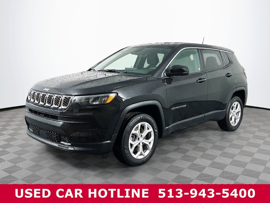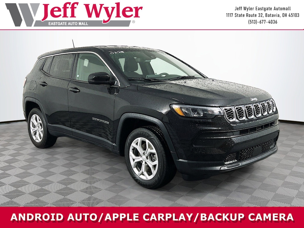 Jeff Wyler Eastgate Auto Mall is pleased to offer this handsome 2024 Jeep Compass Sport in Diamond Black Crystal Pearlcoat. Well equipped with: Quick Order Package 29A, 17" x 7" Aluminum Wheels, 3.73 Final Drive Ratio, 4-Wheel Disc Brakes, 6 Speakers, ABS brakes, Air Conditioning, Alloy wheels, AM/FM radio: SiriusXM, Brake assist, Bumpers: body-color, Cloth Low-Back Bucket Seats, Compass, Delay-off headlights, Driver door bin, Driver vanity mirror, Dual front impact airbags, Dual front side impact airbags, Electronic Stability Control, Emergency communication system: Jeep Connect, Four wheel independent suspension, Front anti-roll bar, Front Bucket Seats, Front Center Armrest w/Storage, Front License Plate Bracket, Front reading lights, Fully automatic headlights, Heated door mirrors, Illuminated entry, Knee airbag, Leather steering wheel, Low tire pressure warning, Occupant sensing airbag, Outside temperature display, Overhead airbag, Overhead console, Panic alarm, ParkView Rear Back-Up Camera, Passenger door bin, Passenger vanity mirror, Power door mirrors, Power steering, Power windows, Radio: Uconnect 5 w/10.1" Display, Rear anti-roll bar, Rear seat center armrest, Rear window defroster, Rear window wiper, Remote keyless entry, Security system, Speed control, Split folding rear seat, Spoiler, Steering wheel mounted audio controls, Tachometer, Telescoping steering wheel, Tilt steering wheel, Traction control, Trip computer, and Variably intermittent wipers. CARFAX One-Owner. Ask about available certifications. Used vehicles 10 years of age or newer with less than 100,000 miles are eligible for the Wyler Assurance Program, but eligible vehicles must pass our reconditioning process and multi-point inspection. Provided the vehicle passes inspection, vehicles will be eligible for the 6 month/6,000 mile limited warranty. The 6 month/6,000 mile limited warranty is NOT available on AS-IS vehicles, wholesale vehicles, lease buyback/pass-thru vehicles or un-inspected vehicles. Note that this program can also apply to vehicles where the remaining factory coverage is less than 6 months or 6,000 miles. Please check the Federal Trade Commission (FTC) Buyers guide on the vehicle for full details as to whether or not warranty coverage may apply. Contact Dealer for additional details. The Wyler Assurance 6 month/6,000 Mile limited warranty ends 6 months from the date of the Retail Purchase Agreement (BUYERS ORDER) or when the vehicle's odometer registers 6,000 additional miles to the mileage listed on the BUYERS ORDER, whichever comes first. Your Deductible - The warranty holder on your contract pays the first $100 of each covered repair.