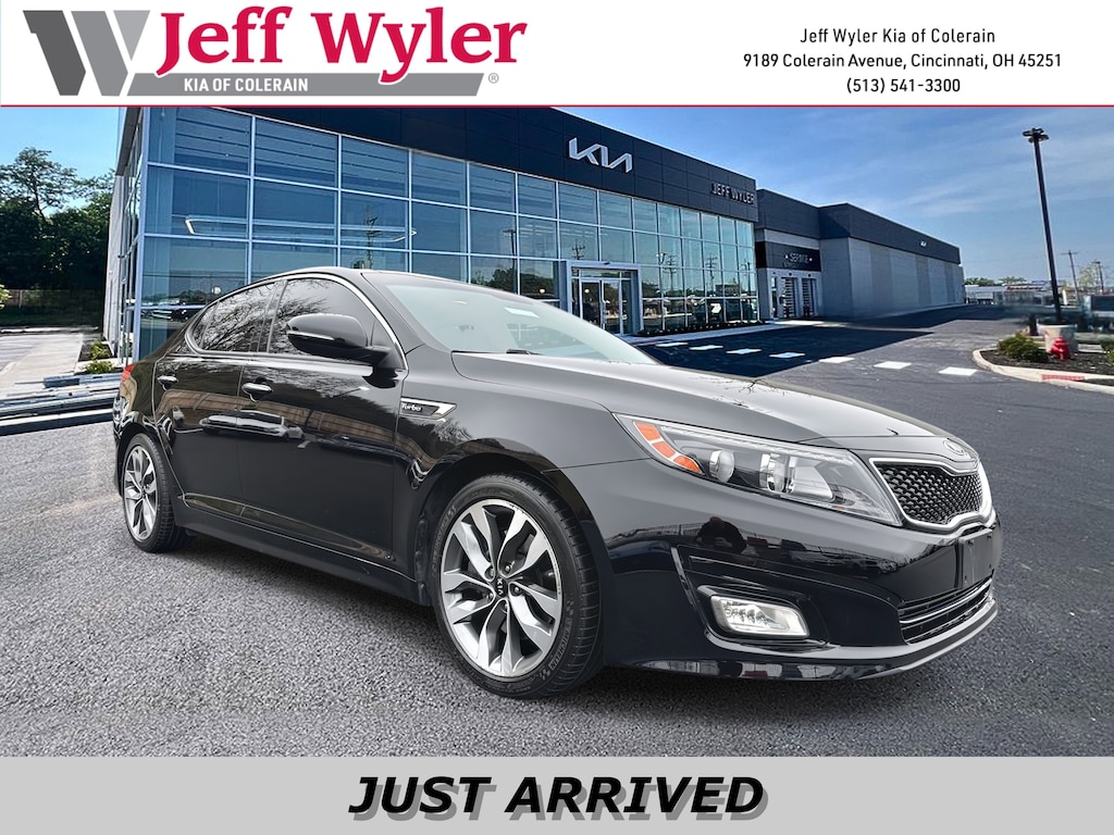 Jeff Wyler Kia of Colerain is excited to offer this fantastic-looking 2015 Kia Optima SX in Ebony Black. SX Technology Package (Blind Spot Detection w/Cross-Traffic Alert, HD Radio, Infinity Premium Sound System, and Radio: UVO eService), SX Turbo Premium Package (4-Way Power Front Passenger Seat, Driver Seat Memory, Gloss Black B-Pillar, Heated & Ventilated Front Seats, Heated Rear Outboard Seats, Panoramic Sunroof, Power Folding Outside Mirrors, and Rear Camera Display), 18" Machined Alloy Wheels, 4-Wheel Disc Brakes, 6 Speakers, ABS brakes, Air Conditioning, Alloy wheels, AM/FM radio: SiriusXM, AM/FM/CD/MP3 Radio, Auto-dimming Rear-View mirror, Automatic temperature control, Brake assist, Bumpers: body-color, CD player, Compass, Delay-off headlights, Driver door bin, Driver vanity mirror, Dual front impact airbags, Dual front side impact airbags, Electronic Stability Control, Four wheel independent suspension, Front anti-roll bar, Front Bucket Seats, Front Center Armrest, Front dual zone A/C, Front fog lights, Front reading lights, Fully automatic headlights, Heated door mirrors, High intensity discharge headlights: Xenon, Illuminated entry, Leather Seat Trim, Leather Shift Knob, Low tire pressure warning, Navigation System, Occupant sensing airbag, Outside temperature display, Overhead airbag, Overhead console, Panic alarm, Passenger door bin, Passenger vanity mirror, Power door mirrors, Power driver seat, Power steering, Power windows, Rear anti-roll bar, Rear Bumper Applique, Rear reading lights, Rear seat center armrest, Rear window defroster, Remote keyless entry, Security system, Speed control, Speed-sensing steering, Split folding rear seat, Sport steering wheel, Steering wheel mounted audio controls, Tachometer, Telescoping steering wheel, Tilt steering wheel, Traction control, Trip computer, Turn signal indicator mirrors, Variably intermittent wipers, and Wheel Locks Our PRE-OWNED vehicles are put through a rigorous 167- POINT QUALITY ASSURANCE INSPECTION along with an average amount of over $1,400.00 SPENT to recondition each vehicle so we can be sure to deliver you the highest quality vehicle like you deserve! ***ONLINE PRICE DOES NOT INCLUDE WYLER FAMILY FIRST PACKAGE***
