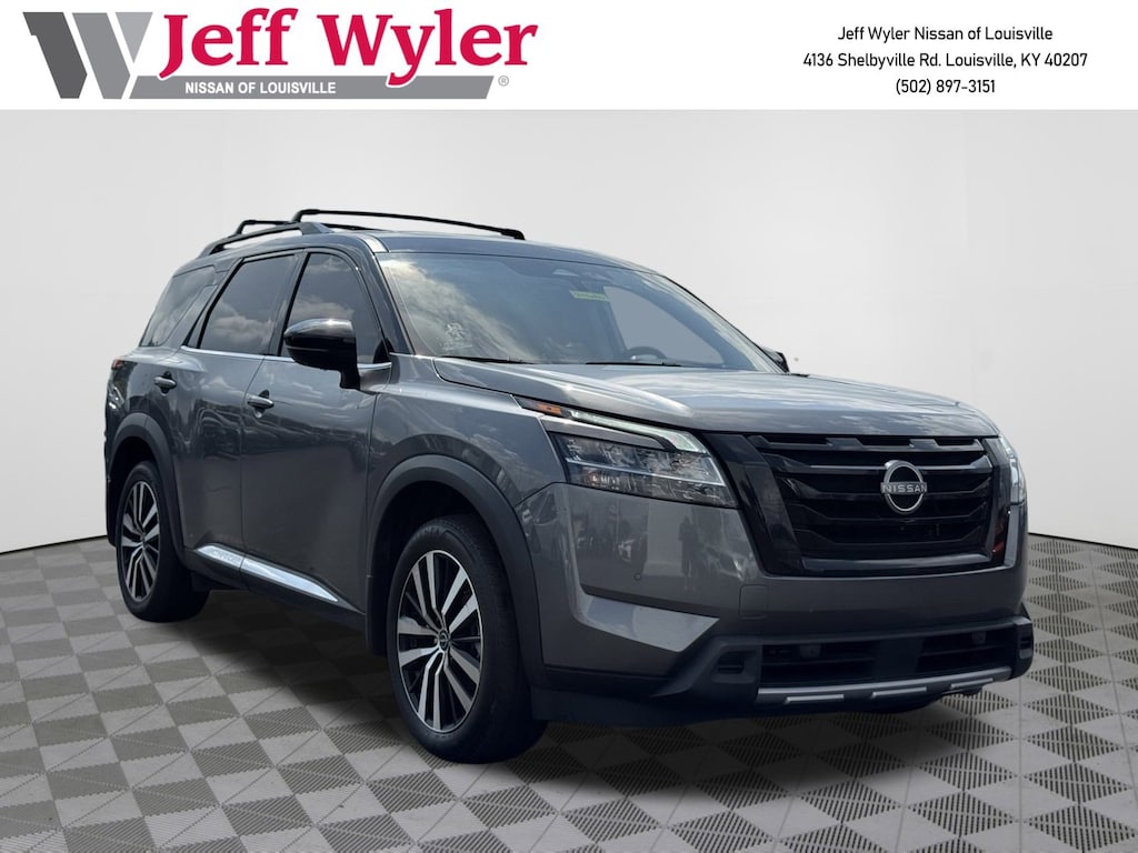 Jeff Wyler Nissan of Louisville is pumped up to offer this stunning 2024 Nissan Pathfinder Platinum in Gun Metallic/Super Black. ** HOME DELIVERY OPTIONS! ** Black Appearance Package (Black Grille (K10) and Black Liftgate Emblems), Cargo Package (Cargo Area Protector, Cargo Net, and First Aid Kit), 4WD, 13 Speakers, 3rd row seats: bench, 4-Wheel Disc Brakes, ABS brakes, Air Conditioning, Alloy wheels, AM/FM radio: SiriusXM, Auto High-beam Headlights, Auto tilt-away steering wheel, Auto-dimming Rear-View mirror, Automatic temperature control, Axle Ratio: 4.334, Bench Seat Carpeted Floor Mats (Set of 4), Black Splash Guards (Set of 4), Bodyside moldings, Bose Premium Audio System, Brake assist, Bumpers: body-color, Cross Bars, Delay-off headlights, Driver door bin, Driver vanity mirror, Dual front impact airbags, Dual front side impact airbags, Electronic Stability Control, Emergency communication system, Exterior Parking Camera Rear, Four wheel independent suspension, Front anti-roll bar, Front Bucket Seats, Front Center Armrest, Front dual zone A/C, Front reading lights, Fully automatic headlights, Garage door transmitter: HomeLink, Heads-Up Display, Heated & Cooled Front Bucket Seats, Heated door mirrors, Heated front seats, Heated rear seats, Heated steering wheel, Illuminated entry, Knee airbag, Leather steering wheel, Low tire pressure warning, Memory seat, Navigation system: NissanConnect with Navigation and Services, NissanConnect featuring Apple CarPlay and Android Auto, NissanConnect w/Navigation & Services, Occupant sensing airbag, Outside temperature display, Overhead airbag, Overhead console, Panic alarm, Passenger door bin, Passenger vanity mirror, Power door mirrors, Power driver seat, Power Liftgate, Power moonroof, Power passenger seat, Power steering, Power windows, Radio data system, Radio: AM/FM Audio System, Rain sensing wipers, Rear air conditioning, Rear anti-roll bar, Rear reading lights, Rear seat center armrest, Rear side impact airbag, Rear window defroster, Rear window wiper, Reclining 3rd row seat, Remote keyless entry, Security system, Semi-Aniline Leather-Appointed Seating Surfaces, Speed control, Speed-sensing steering, Speed-Sensitive Wipers, Split folding rear seat, Spoiler, Steering wheel memory, Steering wheel mounted audio controls, Tachometer, Telescoping steering wheel, Tilt steering wheel, Traction control, Trip computer, Turn signal indicator mirrors, Variably intermittent wipers, Ventilated front seats, and Wheels: 20" x 8J Machined Alloy Our PRE-OWNED vehicles are put through a rigorous 167- POINT QUALITY ASSURANCE INSPECTION along with an average amount of over $1,400.00 SPENT to recondition each vehicle so we can be sure to deliver you the highest quality vehicle like you deserve! ***ONLINE PRICE DOES NOT INCLUDE WYLER FAMILY FIRST PACKAGE*** Stop by 4136 Shelbyville Road to see for yourself, or give us a call @ 502-897-3151 to schedule your test drive! 4WD.