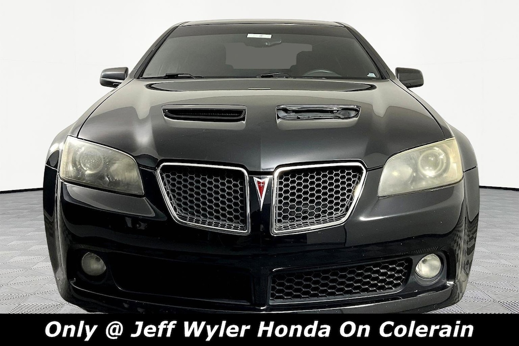 Jeff Wyler Honda of Colerain is very proud to offer this good-looking 2008 Pontiac G8 in Panther Black Metallic. Well equipped with: 18" Silver-Painted Split-Spoke Aluminum Wheels, 4-Wheel Disc Brakes, 7 Speakers, ABS brakes, Air Conditioning, Alloy wheels, AM/FM radio, AM/FM Stereo w/CD Player, Anti-whiplash front head restraints, Brake assist, Bumpers: body-color, CD player, Compass, Delay-off headlights, Driver door bin, Driver vanity mirror, Dual front impact airbags, Dual front side impact airbags, Electronic Stability Control, Emergency communication system: OnStar Safe & Sound, Four wheel independent suspension, Front anti-roll bar, Front Bucket Seats, Front Center Armrest, Front fog lights, Front Sport Bucket Seats, Fully automatic headlights, Illuminated entry, Low tire pressure warning, Occupant sensing airbag, Overhead airbag, Overhead console, Panic alarm, Passenger door bin, Passenger vanity mirror, Power door mirrors, Power driver seat, Power passenger seat, Power steering, Power windows, Premium Cloth Seat Trim, Rear anti-roll bar, Rear seat center armrest, Rear window defroster, Remote keyless entry, Security system, Speed control, Speed-sensing steering, Speed-Sensitive Wipers, Spoiler, Steering wheel mounted audio controls, Tachometer, Telescoping steering wheel, Tilt steering wheel, Traction control, Trip computer, Variably intermittent wipers, and Voltmeter.
