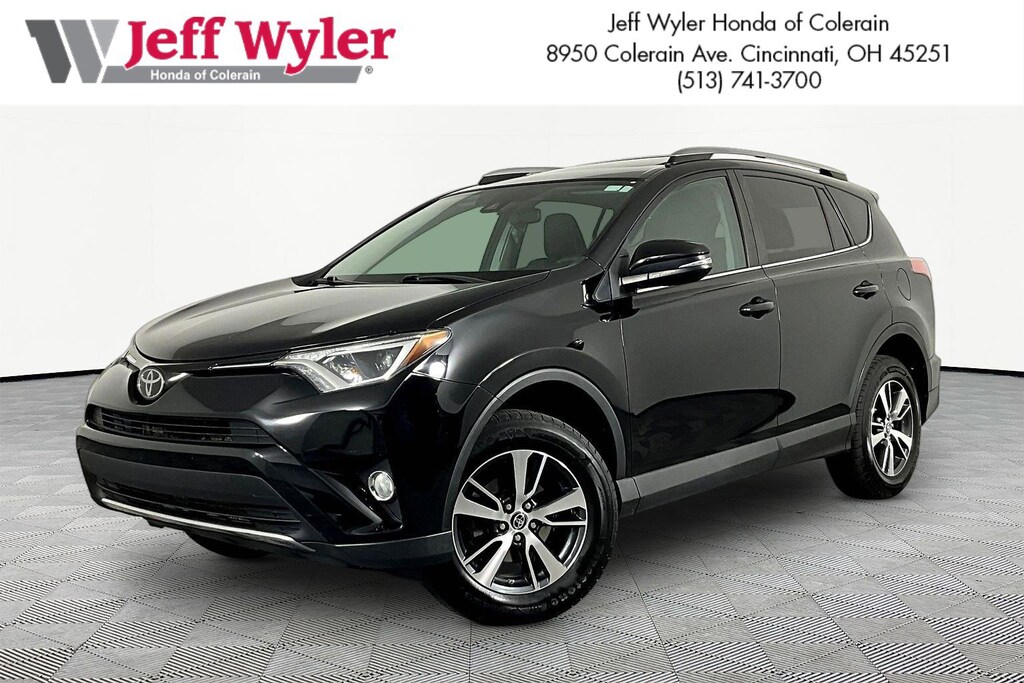 Jeff Wyler Honda of Colerain is pumped up to offer this charming 2018 Toyota RAV4 XLE in Black. Well equipped with: ABS brakes, Active Cruise Control, Alloy wheels, Electronic Stability Control, Front dual zone A/C, Heated door mirrors, Illuminated entry, Low tire pressure warning, Power moonroof, Remote keyless entry, Traction control, 3.815 Axle Ratio, 4-Wheel Disc Brakes, 6 Speakers, Air Conditioning, AM/FM radio, Auto High-beam Headlights, Automatic temperature control, Brake assist, Bumpers: body-color, CD player, Driver door bin, Driver vanity mirror, Dual front impact airbags, Dual front side impact airbags, Exterior Parking Camera Rear, Fabric Seat Trim, Four wheel independent suspension, Front anti-roll bar, Front Bucket Seats, Front Center Armrest, Front fog lights, Front reading lights, Front Sport Seats, Fully automatic headlights, Knee airbag, Leather steering wheel, Occupant sensing airbag, Outside temperature display, Overhead airbag, Overhead console, Panic alarm, Passenger door bin, Passenger vanity mirror, Power door mirrors, Power steering, Power windows, Radio data system, Radio: Entune AM/FM/CD/MP3/WMA Playback w/6 Speakers, Rear anti-roll bar, Rear seat center armrest, Rear window defroster, Rear window wiper, Speed control, Speed-sensing steering, Split folding rear seat, Spoiler, Steering wheel mounted audio controls, Tachometer, Telescoping steering wheel, Tilt steering wheel, Trip computer, Turn signal indicator mirrors, Variably intermittent wipers, and Wheels: 17" x 7.0J 5-Spoke Superchrome Alloy.